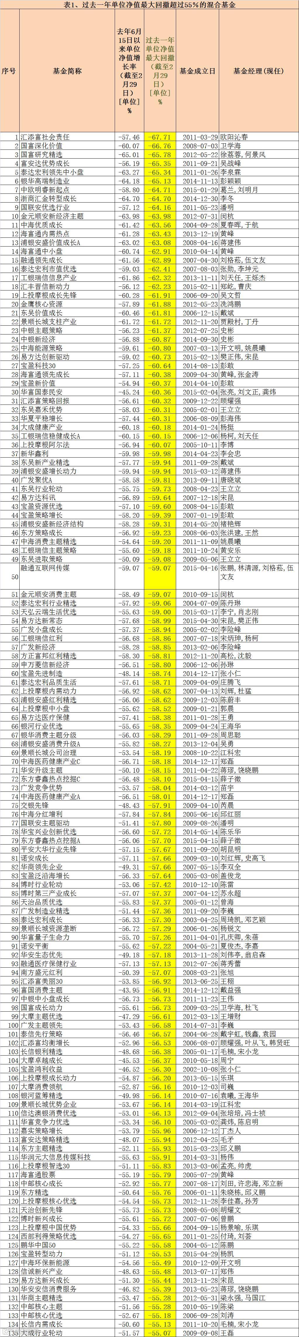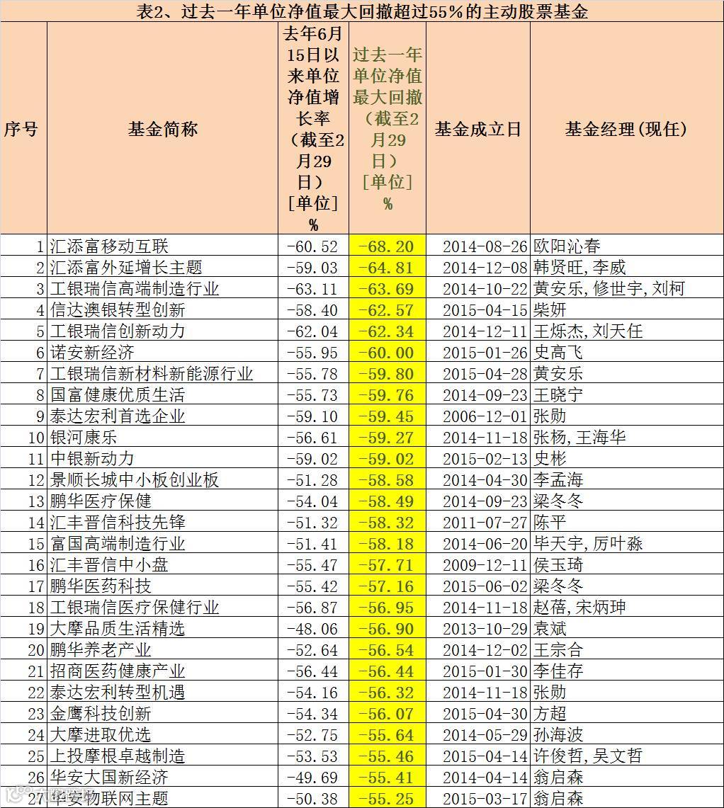 据Wind资讯统计,在约140只主动股票型基金中,共有55只基金最大净值回撤超过50%,净值在本周一(2月29日)创出新低的基金不在少数。其中有6只基金最大回撤超过60%,回撤最大的达到68.2%,这也是过去一年回撤最大的基金。