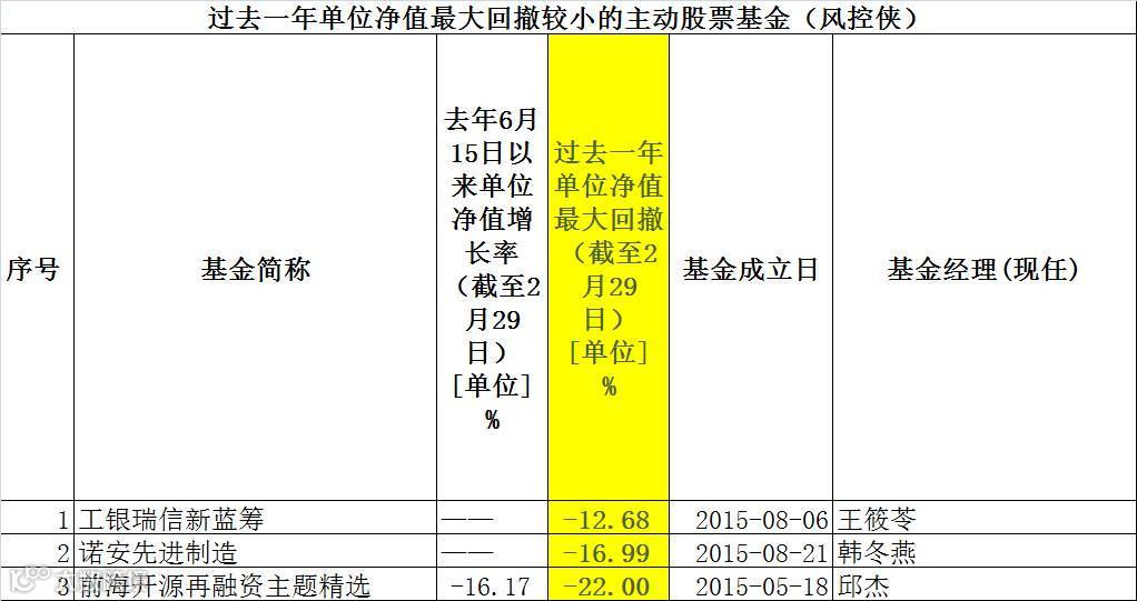 虽然股票基金整体回撤较大,但一些基金还是能较好地控制住了组合风险,如工银瑞信新蓝筹、诺安先进制造和前海开源再融资主题精选基金单位净值最大回撤分别只有12.68%、16.99%和22%,虽然这些基金在股灾中有建仓期的优势,但经历多轮暴跌,他们依然能较好地控制下行风险,风控能力实在不俗。