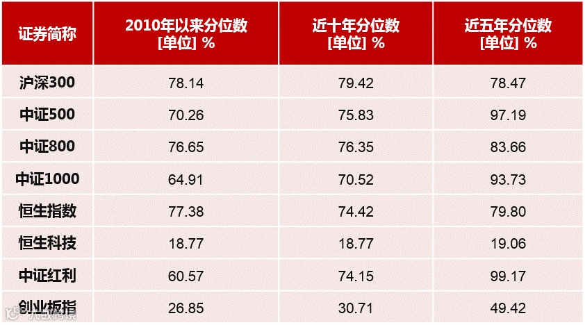 各大指数市盈率分位数对比