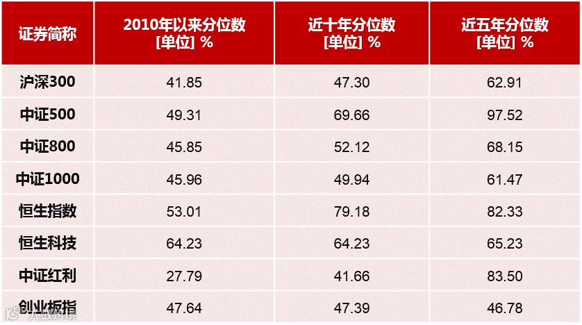 市净率指标来看,除了港股,A股主要指数历史分位在40%以上,尽管宽基指数市盈率有一定的高估,但是市净率较为合理。