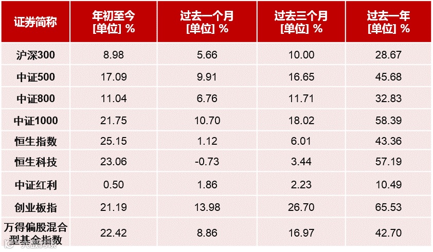 注:各指数代码:沪深300(000300),中证500(000905),中证800(000906),中证1000(000852),创业板指(399006),恒生指数(HSI.HI),恒生科技(HSTECH.HI),中证红利(000922),万得偏股混合型基金指数(885001)。