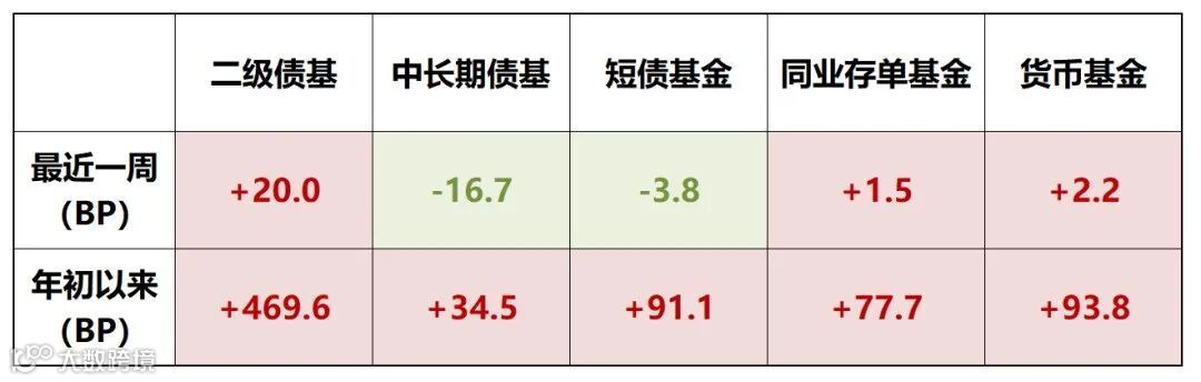 注:数据来源于Wind,口径截至2025/9/14。其中二级债基、中长期债基、短债基金、同业存单基金、货币基金分别对应万得混合债券型二级基金指数(885007.WI)、万得中长期纯债型基金指数(885008.WI)、万得短期纯债型基金指数(885062.WI)、万得同业存单基金指数(885045.WI)、万得货币市场基金指数(885009.WI)。债券利率上行,对应着债券价格下跌,意味着固收类产品的净值趋于震荡或下滑,投资收益下降。反之,债券利率下行,对应着债券价格上涨,意味着固收类产品净值上行,投资收益上升。基金净值上涨1BP=上涨0.01%。