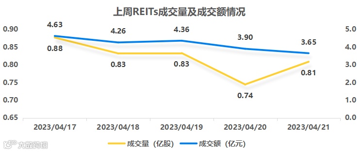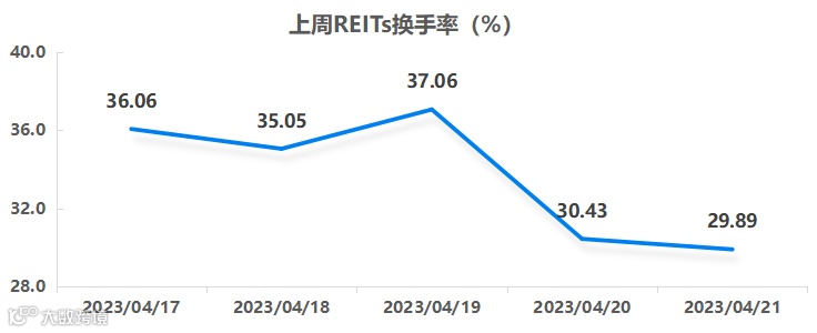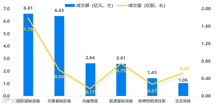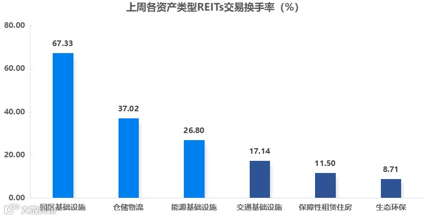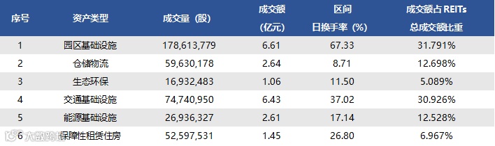 上周合计成交量4.095亿股,成交额20.795亿元,区间换手率168.489%。各资产类型方面,上周园区基础设施REIT成交量最高,共计1.786亿股;生态环保基础设施REIT成交量最低,共计0.169亿股。另外在成交额占REITs总成交额比重中,园区基础设施REIT(31.791%)排名较高,生态环保基础设施REIT(5.089%)排名较低。