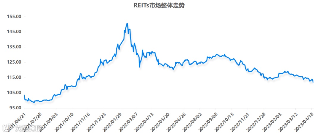 截至2023年4月21日,27只REITs总市值自上市以来累计涨幅2.101%,其中深圳能源REIT累计涨幅最高,达35.210%,上市以来,REITs市场整体走势如下图所示: