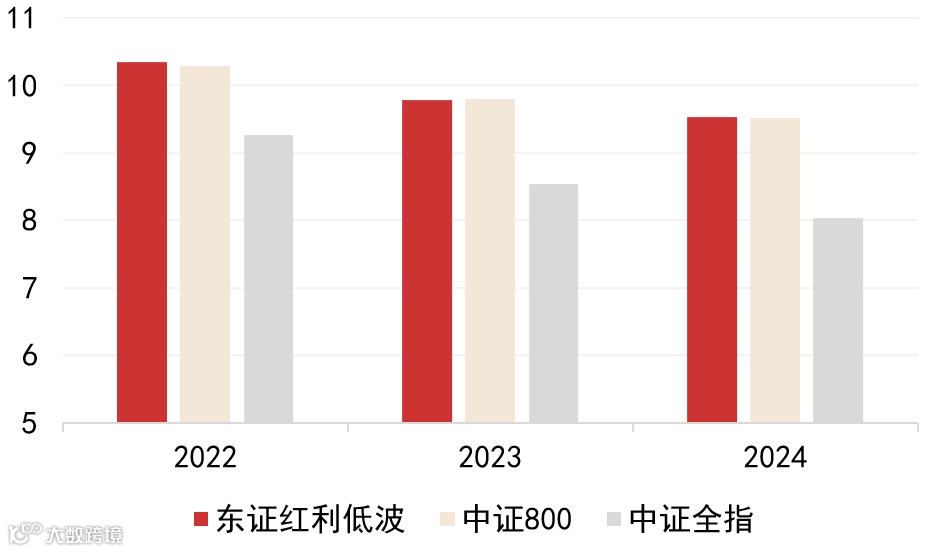 Wind数据显示,2022-2024年,东证红利低波指数ROE维持在10%左右的高位,与同期中证800指数较为接近,显著高于同期中证全指。从发展趋势来看,东证红利低波指数盈利能力呈现企稳态势,尤其是2024年下半年以来,经营情况有所改善,净利润同比温和增长,红利资产本身的盈利质量为较高的股息率提供了保障。