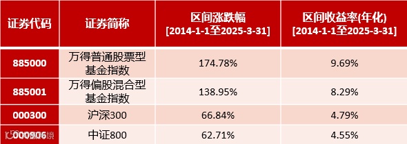 如果你是一个坚持长期投资主义的基金投资者,那么过去10年以来你的累计收益大概率还是不错的。Wind统计,自2014年1月1日至2025年3月31日,万得普通股票型基金指数上涨了174.78%,区间年化收益率为9.69%;万得偏股混合型基金指数上涨了138.95%,区间年化收益率为8.29%。