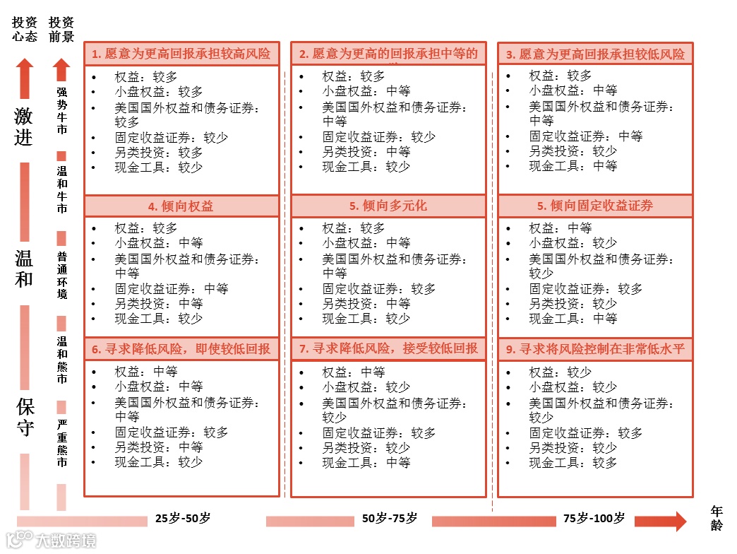下图综合了个人情况和市场环境,通过二维坐标展现了过去美国投资者的资产选择和配置比例,投资者可以适度参考。