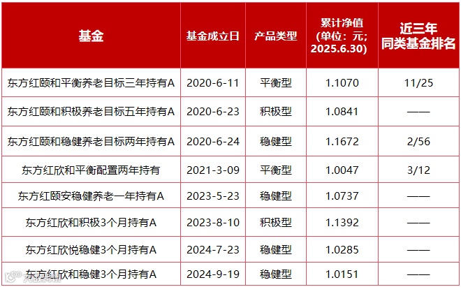 根据银河证券基金评价数据,截至2025年6月30日,东方红颐和稳健养老两年FOF(A类009174)过去三年在同类基金中排名第二(排名2/56);东方红欣和平衡两年混合FOF过去三年在同类基金中排名第三(排名3/12),过去一年排名第五(排名5/27)。