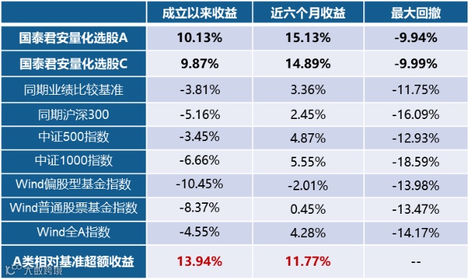 我们团队还有一只核心产品——国泰君安量化选股(A类:016466/C类:016467),A/C类份额成立以来累计收益分别为10.13%/9.87%,跑赢业绩比较基准超13%,显著超越同期市场主流指数。[3]