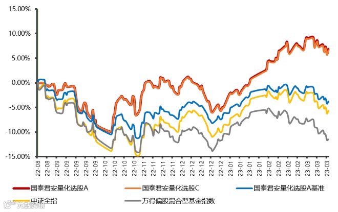 [3]数据来源:Wind、国君资管,产品业绩经托管复核;统计区间:2022年8月18日至2023年3月22日;国泰君安量化选股A/C类份额2022年度(2022.8.18-2022.12.31)收益-4.95%/-5.09%,同期业绩比较基准收益-8.15%,超额收益=国泰君安量化选股收益-基准指数收益。