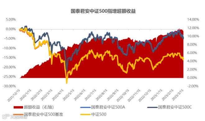 [1]数据来源:Wind、国君资管,产品业绩经托管复核;统计区间:20211215-20230317;国泰君安中证500指增A/C成立于2021年12月15日,成立以来收益-4.22%/-4.70%,同期业绩比较基准为-14.74%,同期中证500指数为-15.58%;国泰君安中证500指数增强A/C类份额2021年度(2021.12.15-2021.12.31)收益1.49%/1.47%,同期业绩比较基准收益0.46%;2022年度收益-11.34%/-11.70%,同期业绩比较基准收益-19.30%。超额收益=国泰君安中证500指增收益-中证500指数收益。排名来源:银河证券,截至20230317;国泰君安中证500指增A/C过去一年(20220318-20230317)收益为5.10%/4.68%,同期业绩比较基准收益为0.52%;A类排名口径为银河证券股票基金-增强指数股票型基金-增强规模指数股票型基金(A类)排名10/127;C类排名口径为股票基金-增强指数股票型基金-增强规模指数股票型基金(非A类)排名11/104。