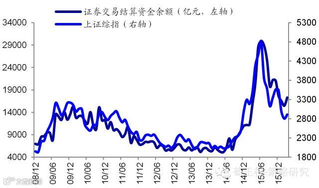 股市涨跌与资金流动相生相长。股市涨跌伴随着资金的流入流出,整体上看证券交易结算资余额和上证综指的走势基本一致: