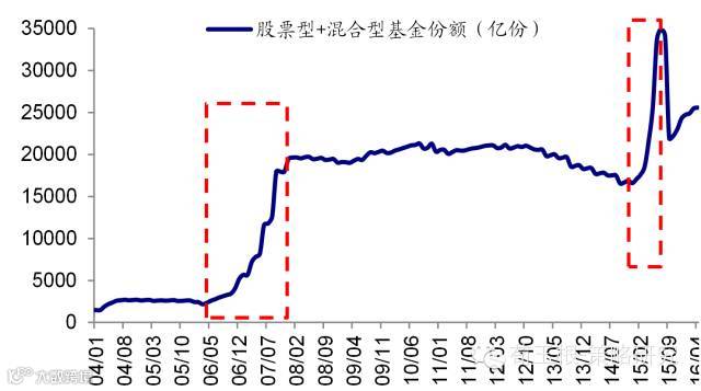 此外在06年牛市行情中,06年5月时指数已经有一定涨幅形成“赚钱效应”,此时公募基金大规模流入股票市场。