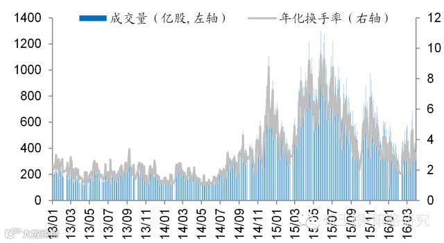 资金牛市期间成交量和换手率也大幅增加,日平均成交量为578亿股,平均年化换手率为501%,为存量博弈市时的三倍。