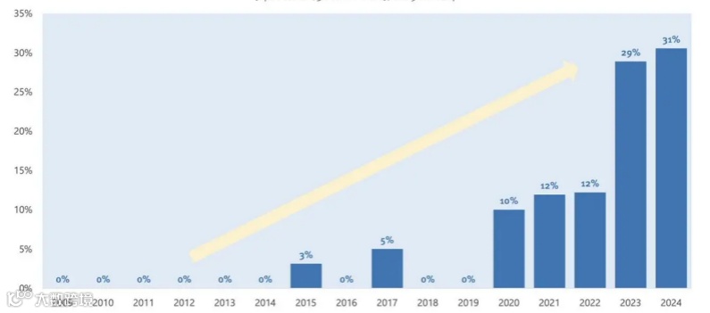 同时,会场外的数据同样灼目,据Evaluate Pharma统计,全球临床管线中每5个项目就有1个烙下中国印记,ADC、双抗、CAR-T领域中国创新药企参与比例甚至超过一半。研究公司Dealforma统计了全球预付款超过5000万美元的药物引进交易。2014年之前,大型制药公司与中国Biotech进行大额交易的比例几乎为零。到2020年,这一比例迅速增长,2024年已暴涨至31%(注1)。