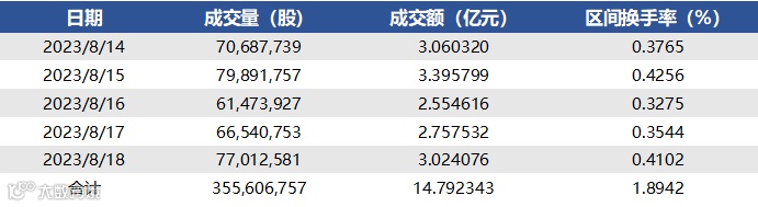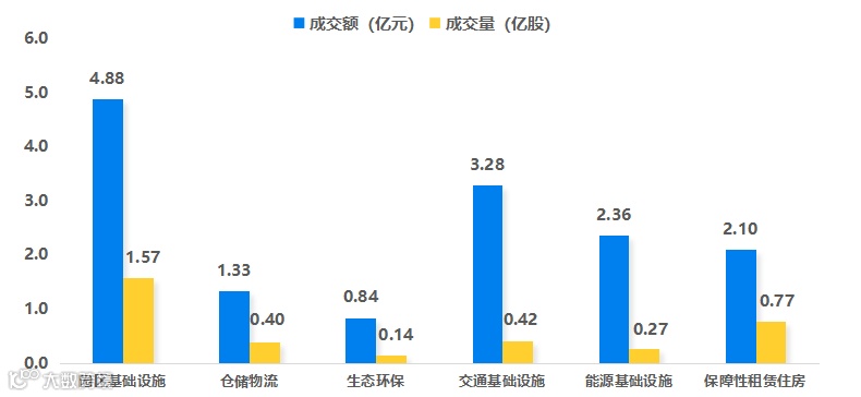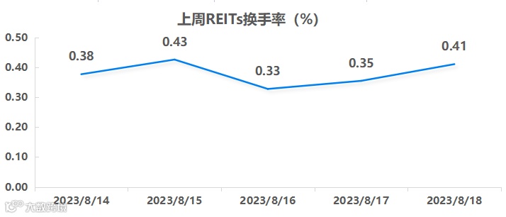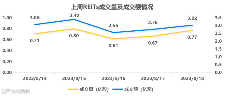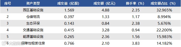 2023年8月14日至2023年8月18日,合计成交量3.556亿股,成交额14.792亿元,区间换手率1.894%。各资产类型方面,上周园区基础设施REIT成交量最高,共计1.569亿股;生态环保基础设施REIT成交量最低,共计0.143亿股。另外在成交额占REITs总成交额比重中,园区基础设施REIT(32.965%)排名较高,生态环保基础设施REIT(5.676%)排名较低。