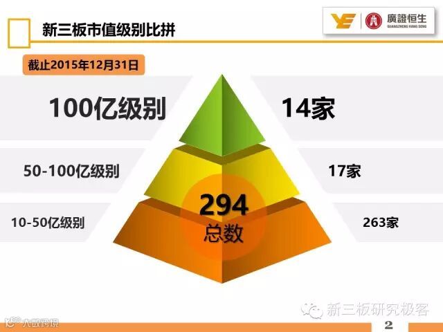 294家入选10亿市值俱乐部,市值总和达9281亿元,占新三板总市值的一半以上。从整体数量看,一年时间入选10亿以上市值企业的数量增长6倍,市值超100亿和市值在50到100亿之间的企业分别有14家和17家,大多数上榜企业市值都介于10亿到50亿之间,梯队呈金字塔状。
