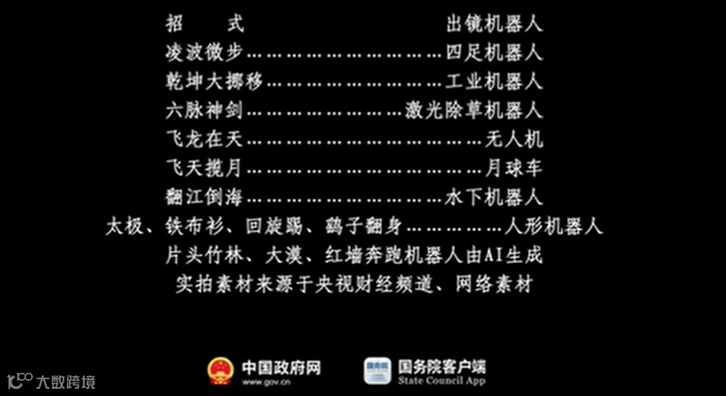 其实早在“两会”前夕,中国政府网就发布了一则宣传视频《机器人群侠传》,视频中无人机、月球车和人形机器人等“群侠”相继出现,展示凌波微步、飞龙在天等招式,惊艳全网。