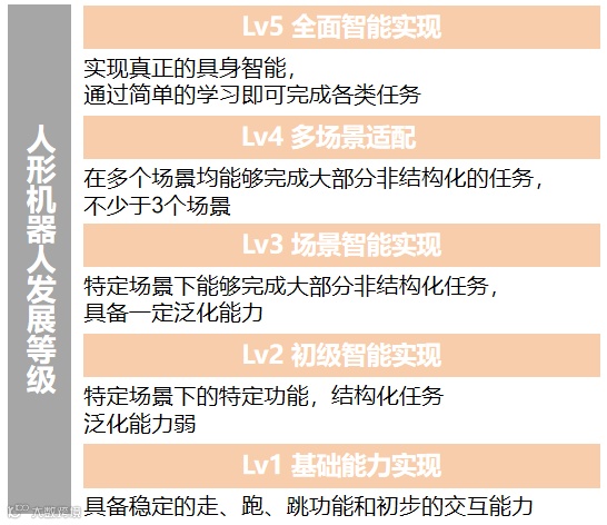 从机械执行体向智能生命体的跃迁,本质上是人工智能技术对传统机器人架构的降维重构。机械结构给机器人以“形”,而AI技术的突破则通过模拟人类认知与决策,实现从被动响应到主动进化的质变,为其注入“灵魂”。按照智能化程度,人形机器人可被分为L1至L5五个层级,目前大多数全能型人形机器人产品处于L1,少量头部企业已进军L2。未来,技术迭代将推动机器人向L5迈进,实现真正感知、决策、执行闭环的高度智能化。