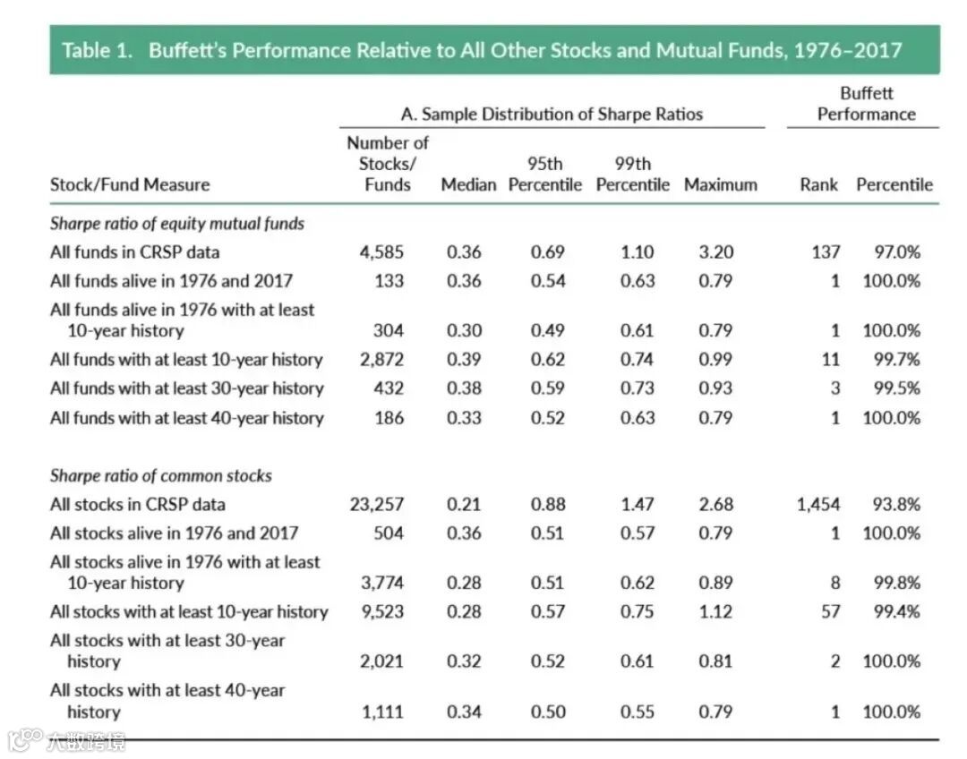 首先,巴菲特到底有多优秀呢?我们简单选取了伯克希尔从1976年10月到2017年3月超过40年的业绩表现。在这个阶段,巴菲特的夏普比高达0.79,是市场平均的1.6倍。巴菲特的收益率,和所有股票相比,排名在前7%。