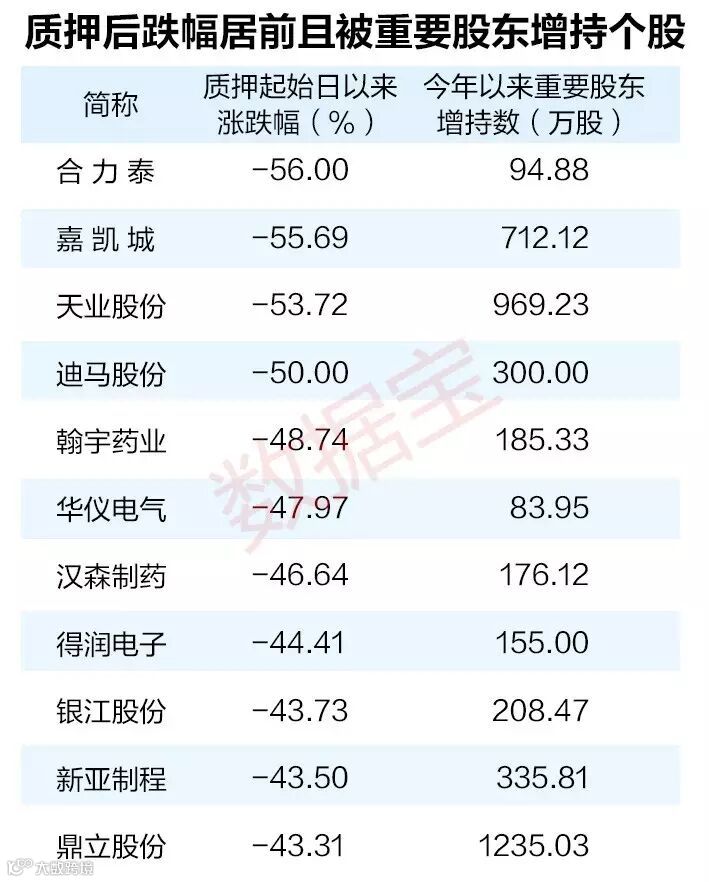 数据宝统计,去年以来发生股权质押,且至今仍未解押的962家上市公司中,有65家上市公司股价逼近预警线,部分公司股价甚至触及平仓线。