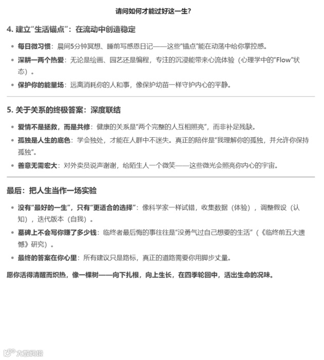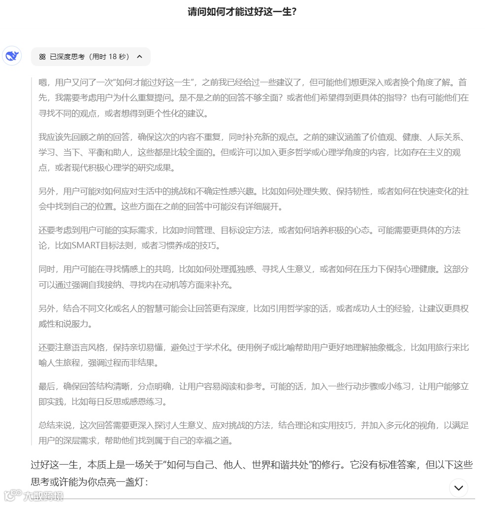 我们通过与DeepSeek聊天机器人的多次对话发现,DeepSeek-R1的深度思考模式会展示详细的思维的过程,这种推理的透明化更加有利于用户拆解问题和反复学习。而更令我们震惊的是,DeepSeek还能捕捉用户的情绪并给予反馈。当我们问DeepSeek“我们该如何过好这一生?”它的回答是这样的——