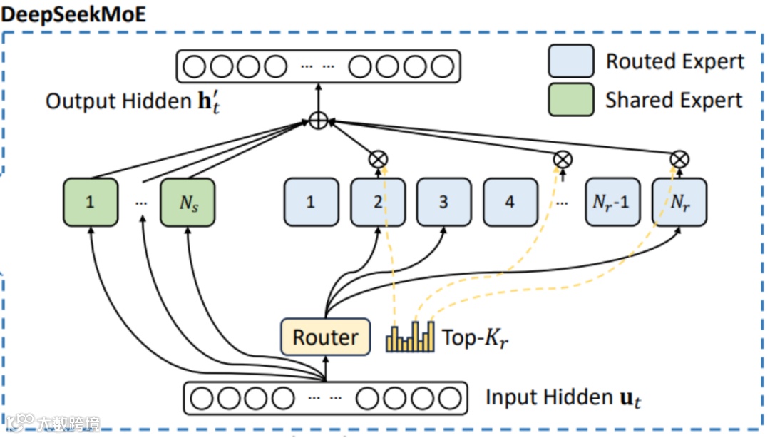 除此之外,DeepSeek在模型论文中还介绍道,相较于传统MoE,DeepSeek使用了更细颗粒度的专家,使得专家更加专门化,特定任务只激活特定专家,降低了传统稠密模式需激活全部参数的计算量,进而提升了任务适配性;同时,DeepSeek将一些专家隔离为“共享专家”,用于减轻专家之间的知识冗余,使模型在激活相同数量专家和参数的情况下表现更好。