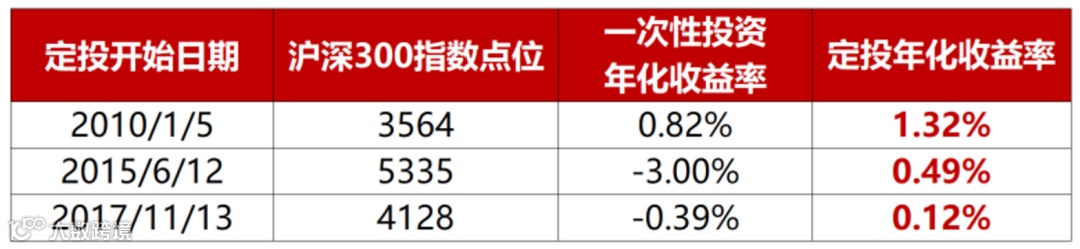 我们可以从数据中看到,即使在历史牛市的高点开启定投,只要坚持长期投资,最终都有很大概率能够获得正收益。