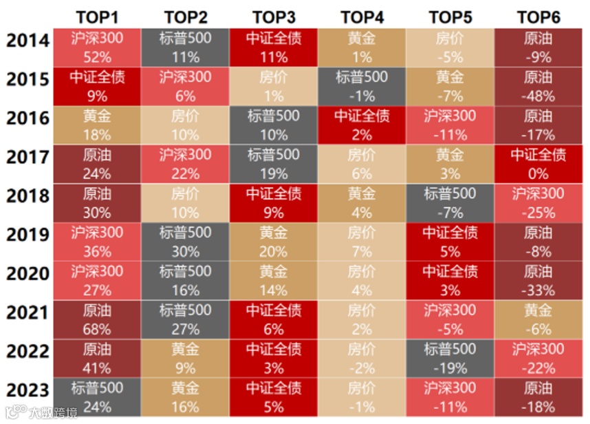 数据来源:Wind,2014.1.1-2023.12.31。沪深300指数(000300.SH),中证全债指数(H11001.CSI),黄金用黄金ETF指数(885176.WI),标普500指数(SPX.GI),原油采用英国布伦特Dtd现货价(美元计价),房价采用中国:房屋销售价格指数:新建商品住宅:70个大中城市:环比(国家统计局)。历史指数表现仅供参考,不代表未来表现,也不作为收益承诺。