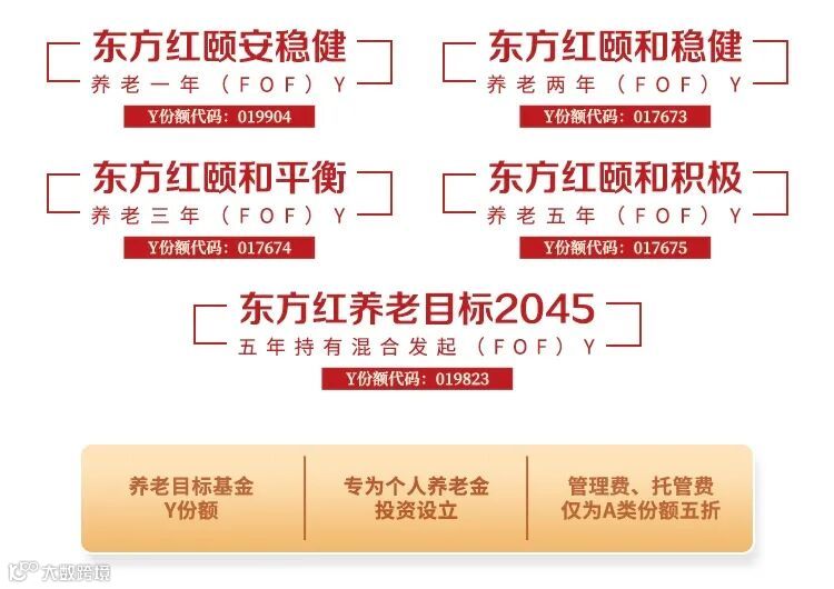 为了支持第三支柱个人养老金的发展,2022年底养老目标基金首次设立了Y份额,其费率比A、C份额更加优惠。东方红资产管理目前已有5款养老目标基金增设了Y份额,能够满足不同风险收益偏好的投资者需求,助力各位投资者养老早规划,未来更轻松!