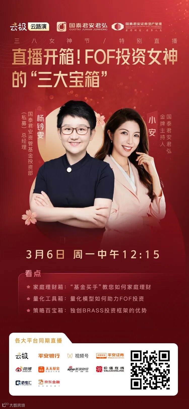3月6日(星期一)中午12:15国泰君安资管直播间,国泰君安资管基金投资部(私募)总经理 杨钤雯 将为大家倾情讲解,不见不散!