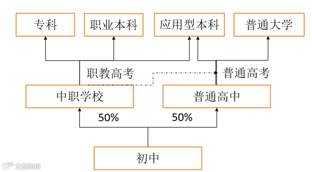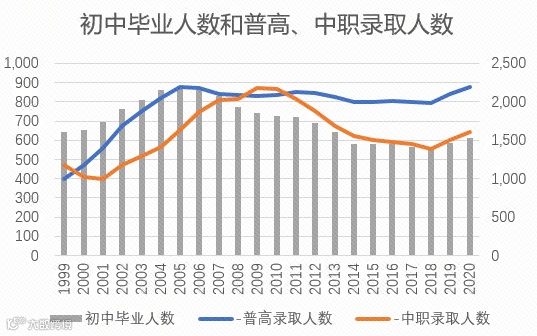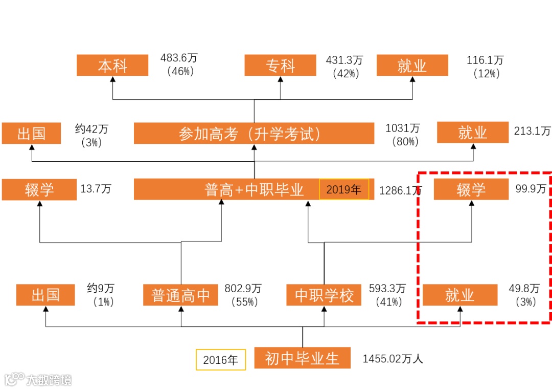 以2019届高考学生为例,2016年初中毕业后55%学生进入普高,41%进入中职,约有50万人初中毕业后进入就业市场。