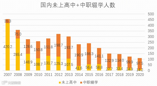 从初中毕业生去向看,未上高中的人从2007年的420.2万人减少到2020年14.2万人,几乎实现所有学生初中毕业之后就能上高中,在总量问题得到解决后,其中的结构问题是下一步解决的关键点。