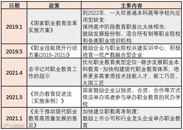 职业教育发展是大势所趋,但也是一个漫长的过程。在社会观念、就业以及升学制度的建设上需要长期投入。其中高教公司、教学系统服务商和上市公司参与职业教育发展的投资机会值得重视。