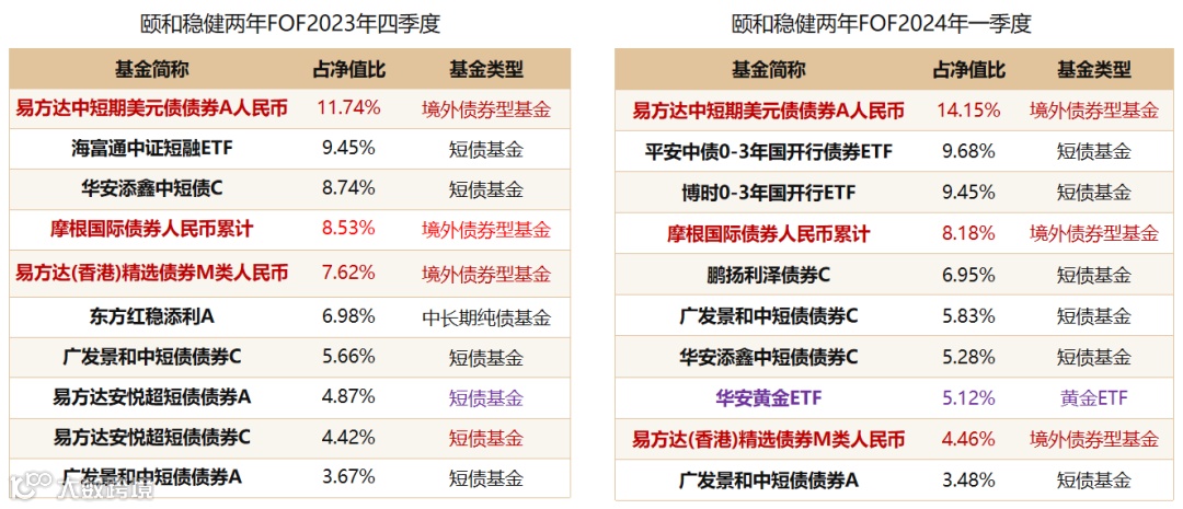 FOF要真正实现多资产多策略配置,才能构筑自己的壁垒,实现大类资产配置的能力(Beta)+子基金的优选(Alpha)的双击。东方红FOF现有的偏债混FOF正在努力进行多元资产的实践,为客户的绝对收益创造更多可能。根据2023年四季报,我们的偏债混FOF在2023年四季度提前布局美债,持仓结构丰富地好像是一桌满汉全席:有QDII海外债基,香港互认海外债基,有黄金ETF,有债券ETF,有主动管理债基。