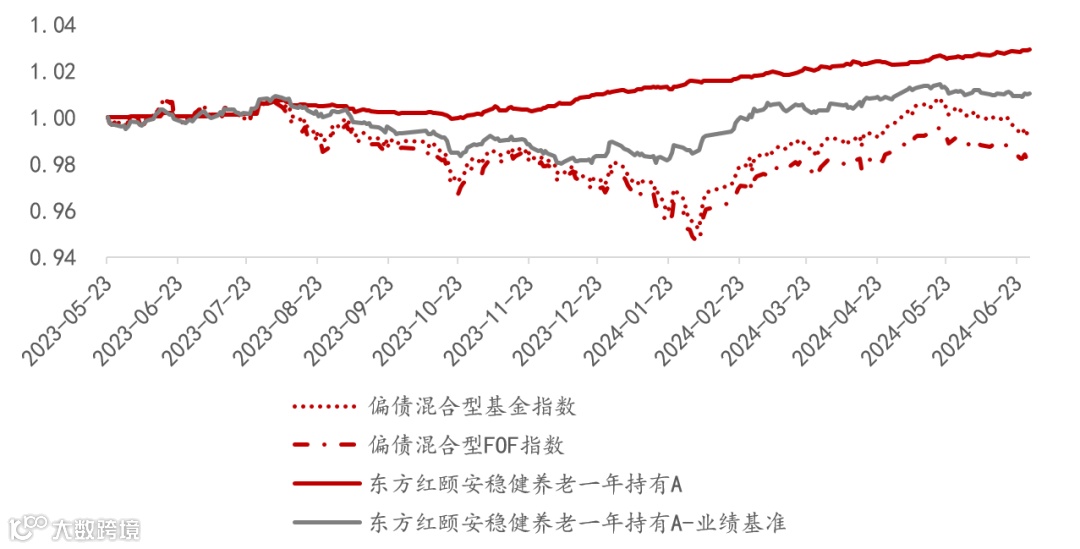 数据来源:东方红颐安稳健养老一年持有A净值及其业绩比较基准数据来源于东方红颐安稳健养老一年持有A2024年二季度报告,偏债混合型基金指数(885003)、偏债混合型FOF指数(885075)数据来源于Wind,数据区间:2023.05.23-2024.06.30。