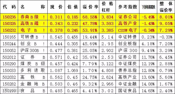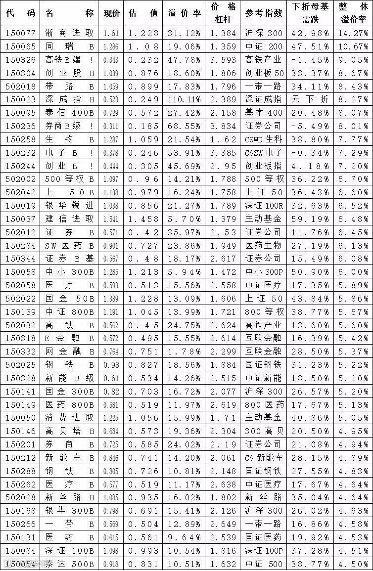 (点击图片可放大,数据来源:集思录;此处仅列举整体溢价率在4.5%以上的分级B,具体数据以公告为准)