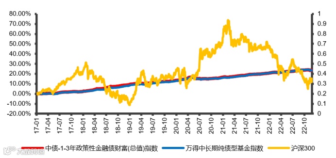 政金债指数与权益类资产的相关性极低,因此可以作为股市震荡时的“避风港”,也可以作为自己投资组合中的“压舱石”。Wind数据显示,2017年至2022年11月底,沪深300指数与1-3年政金债指数收益的相关性仅为-0.09。