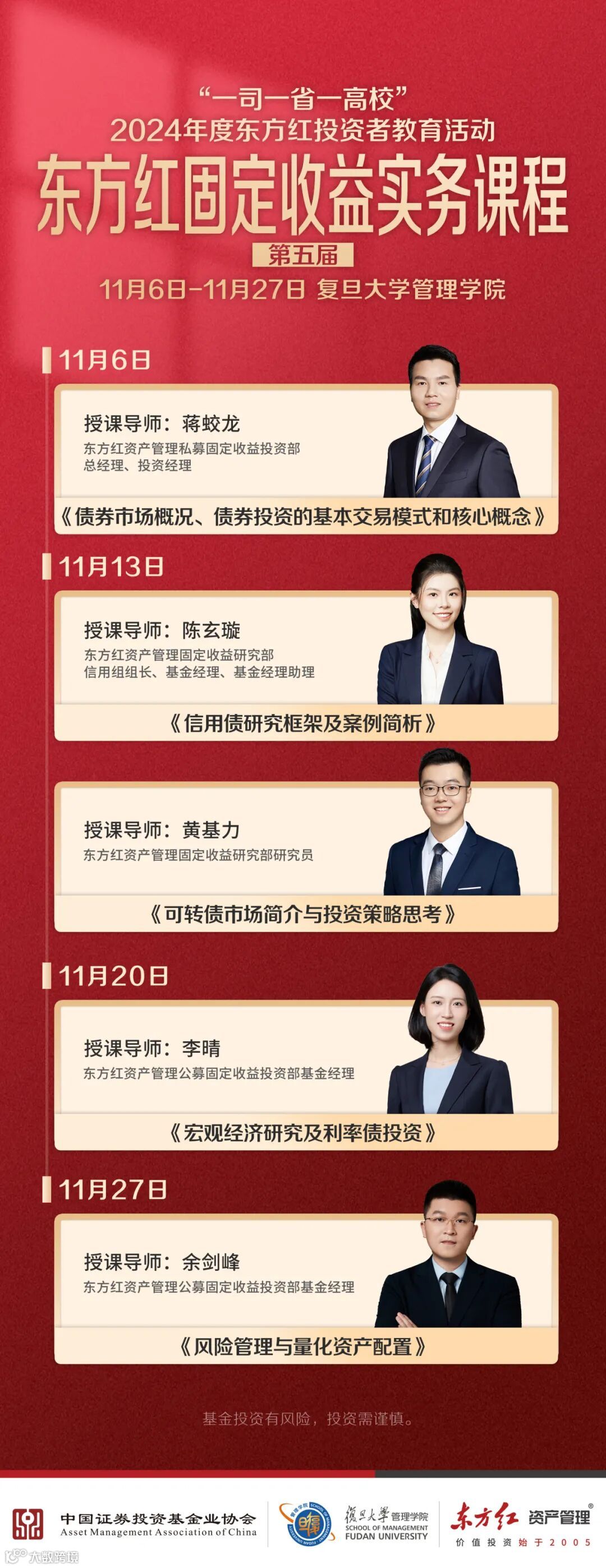 2024年11月6日至27日,在中国证券投资基金业协会的指导下,东方红资产管理深入大学校园推进“一司一省一高校”投资者教育活动,与复旦大学管理学院合作开展的第五届“东方红固定收益实务课程”圆满落幕。