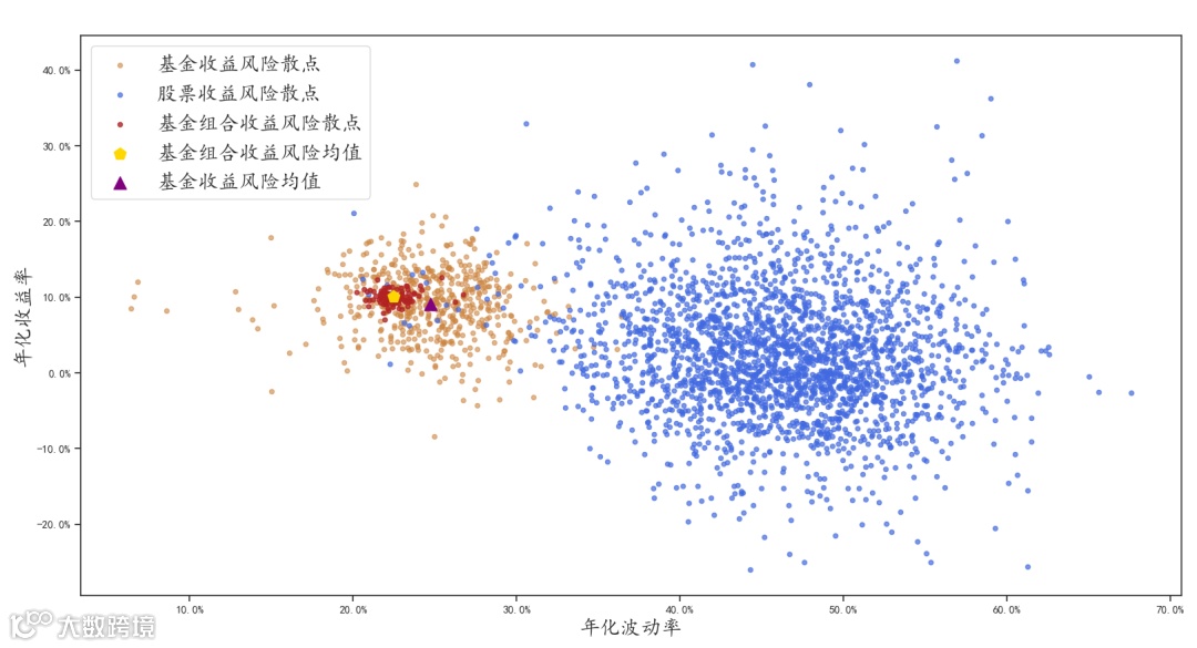 数据来源:Wind,东方红资产管理,蓝色点为股票近十年收益风险散点,黄色点为基金近十年收益风险散点,红色点为模拟100次的随机20只基金近十年收益风险散点,数据截至2024.05.31