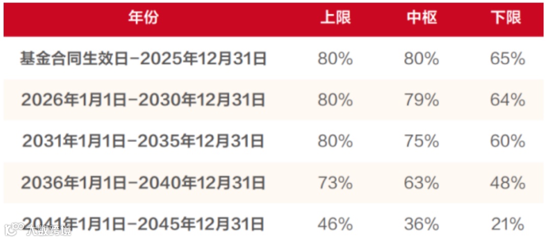 以东方红养老目标2045五年持有混合发起(FOF)为例,早期权益资产比例很高,并且下滑的时间晚、速度慢,直到退休前5-10年,权益资产中枢比例仍然保持63%,在更长的周期内配置较高比例权益资产,有更大概率获得高收益,争取跑赢通胀。退休前5年开始,权益资产比例从63%快速下滑到36%,降低了退休资产大幅缩水的风险,同时保持一定的收益获取能力。