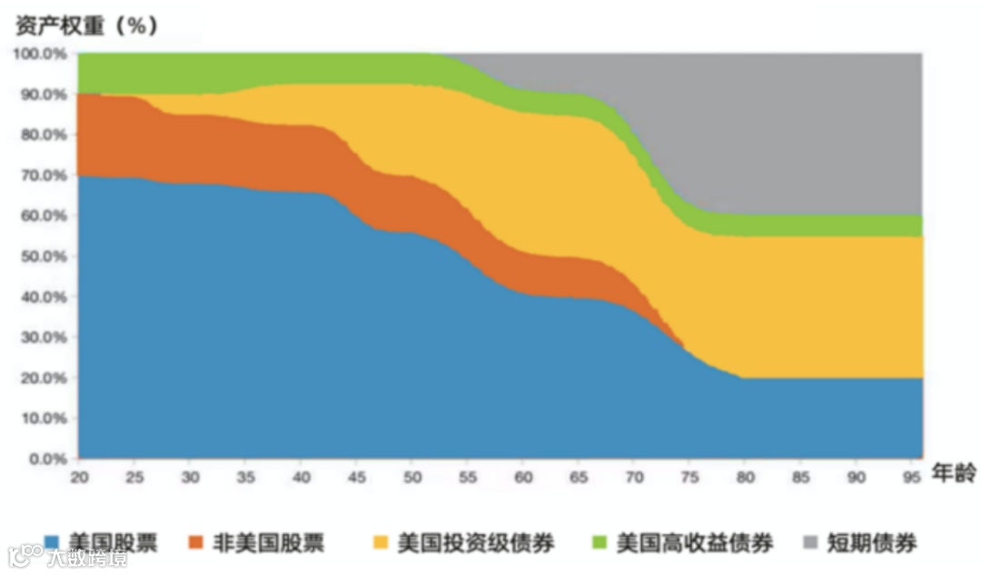 伯顿·马尔基尔曾在《漫步华尔街》中提到,“越临近退休,投资的风险承受能力越低。”我们在规划养老投资时,应随着年龄的增长,不断降低风险资产的配置比例。
