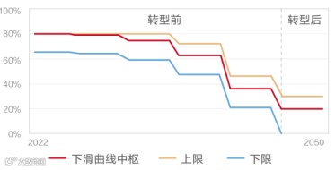 养老目标日期基金的核心模型都基于下滑曲线的设定,当投资人年轻、风险承受力相对较高时,配置相对高一点比例的权益资产;随着退休日期的临近,配置方案越来越稳健,逐步降低权益类资产的比例。长期来看,权益资产的配置中枢不断下移,形成一条下滑曲线。