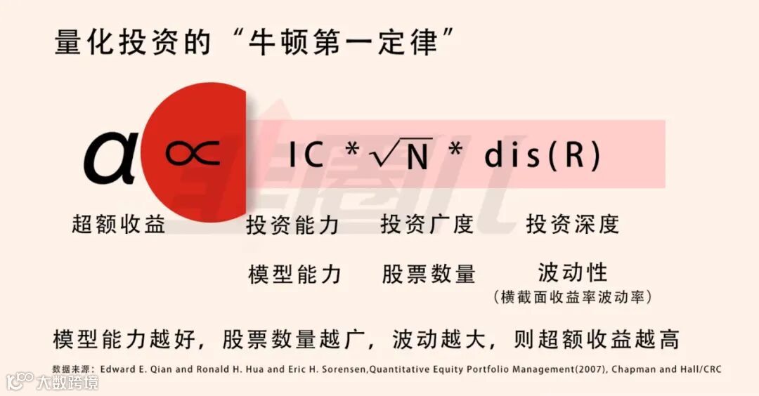第二个层面就是我们讲的投资界牛顿第一定律:一个基金的α超额收益正比于三个层面,分别是信息比率、投资广度以及走势差异度。