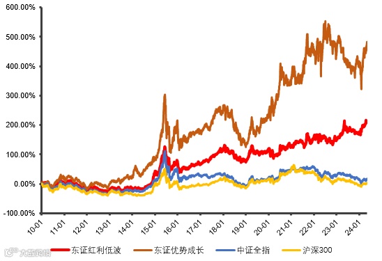 中证东方红红利低波动指数(代码:931446)和中证东方红优势成长指数(代码:931579)均以2009年12月31日为基日,以1000点为基点。自2010年1月1日至2024年5月7日,中证东方红优势成长指数(931579)和中证东方红红利低波动指数(931446)走势均远超中证全指(000985)和沪深300(000300),尤其是中证东方红优势成长指数(931579)表现更为突出。