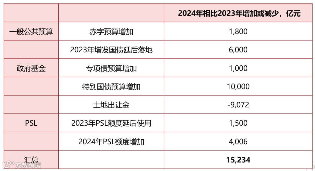 注:2023年增发特别国债假设8000亿结转至2024年使用,因此该项在2024年净增加为8000-2000=6000亿元。2023年1-11月PSL净减少2506亿元,12月增加3500亿元,假设2024年PSL额度为5000亿,因而2024年PSL额度增加为5000-(3500-2506)=4006亿元。