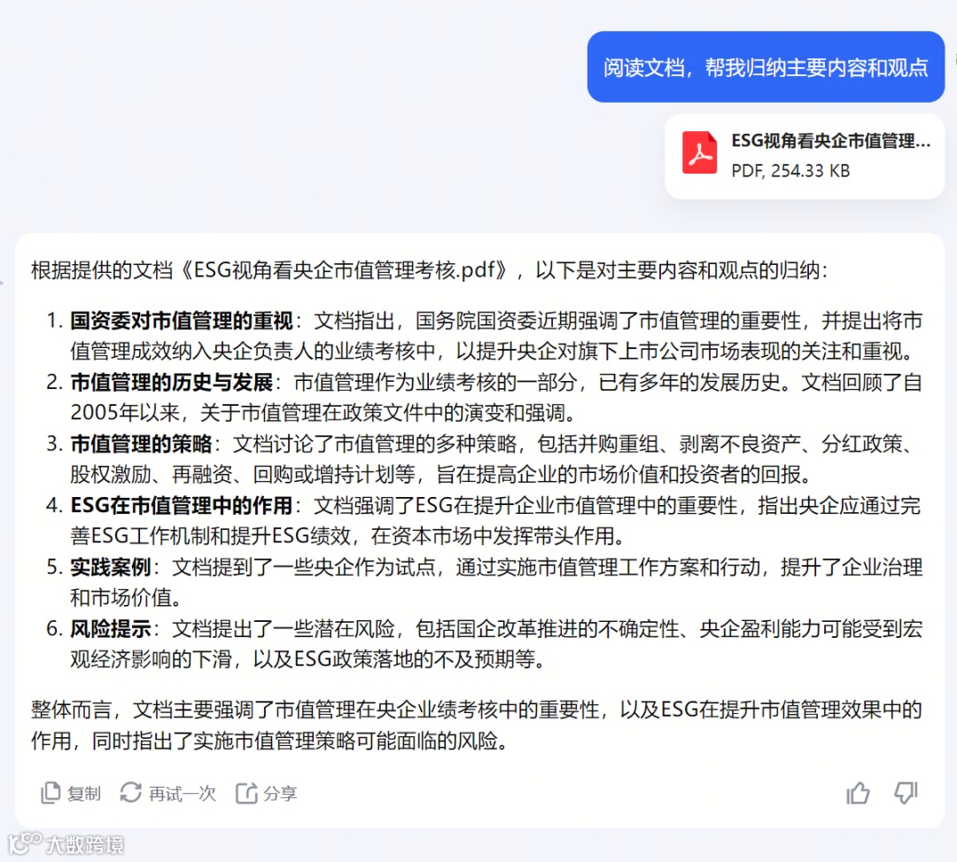 做一个简单的测试,让Kimi读一份研究报告《东方证券:ESG视角看央企市值管理考核》,这是Kimi给出的结果: