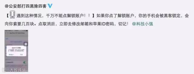 最近一些人的iPhone手机陆续在一夜间突然打不开了,屏幕上只留下一行字——“此Apple ID已锁定,请与QQ××××××联系(或是登录××网站)。”为此,@公安部打四黑除四害官微发布通知:遇到这种情况,千万别点“解锁账户”!