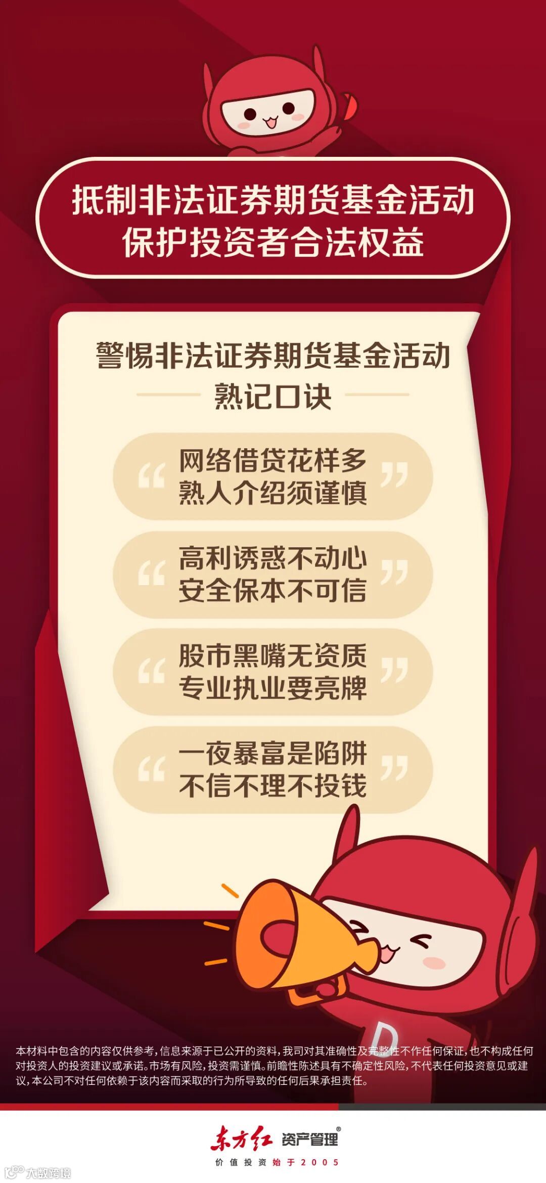 提醒广大投资者要保持理性投资心态,珍惜自己的钱财,选择合法机构,远离非法主体,坚持理性投资,谨防上当受骗。