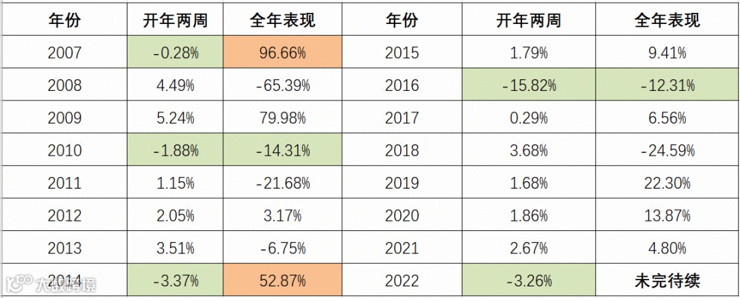 (数据来源:Wind,指数标的为上证综指,统计区间2007.1.1-2022.1.14,开年两周指的是当年1.1-1.14,全年表现指的是当年1.1-12.31,过往数据不代表未来表现)
